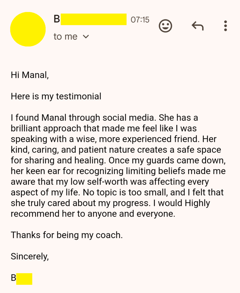 I’m Manal, a trauma-informed coach with a background in life coaching and root-cause emotional work. I support individuals — particularly from Arab and Middle Eastern communities — who want to understand themselves more deeply, heal emotional patterns, and move through life with more clarity, confidence, and emotional stability.